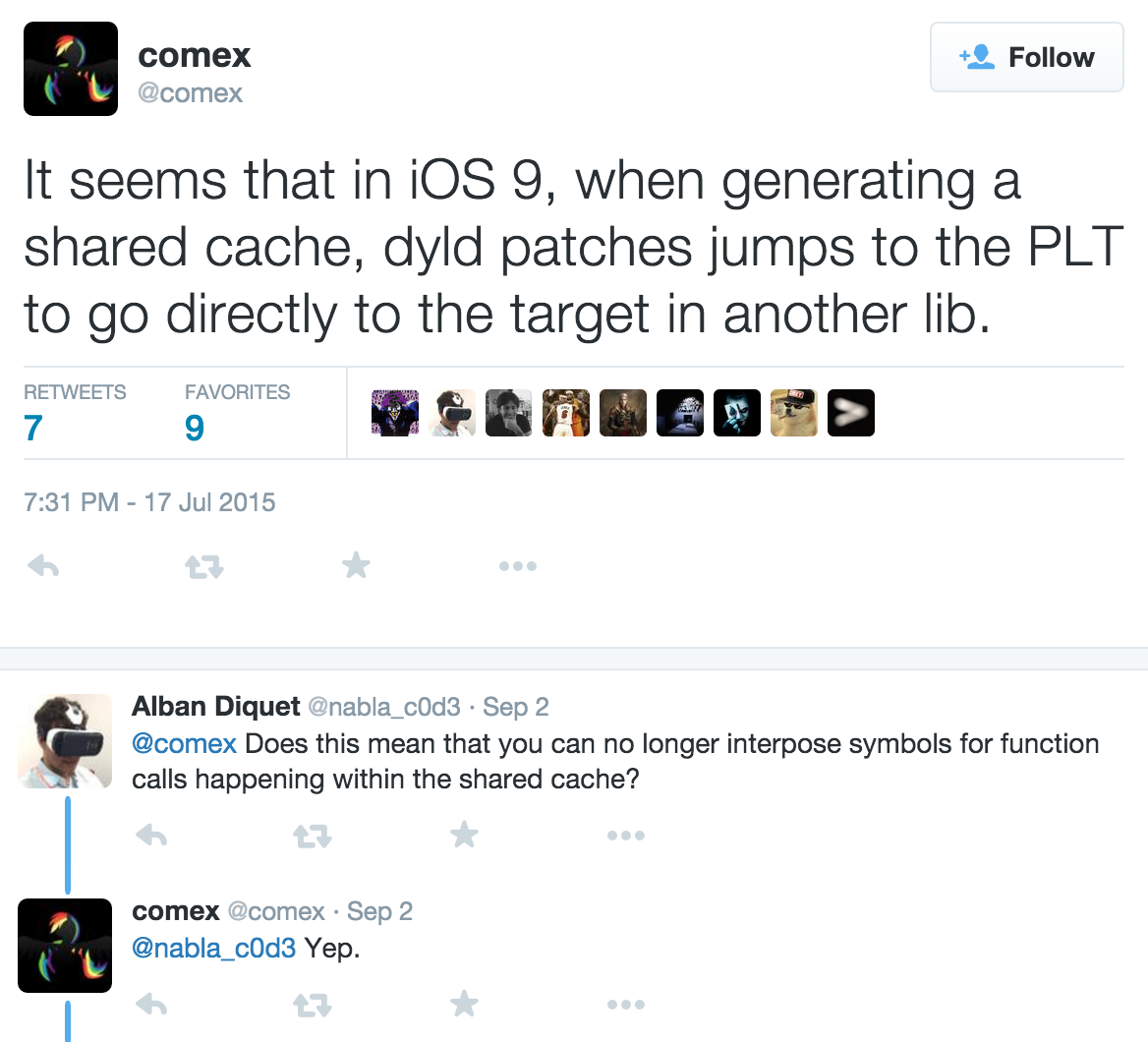 Unfortunately, this also means that some of the techniques we presented at the Black Hat talk for writing secure libraries through function hooking do not work on iOS 9. This also affects other Apps and products as I have been in contact with developers who faced the exact same issue.